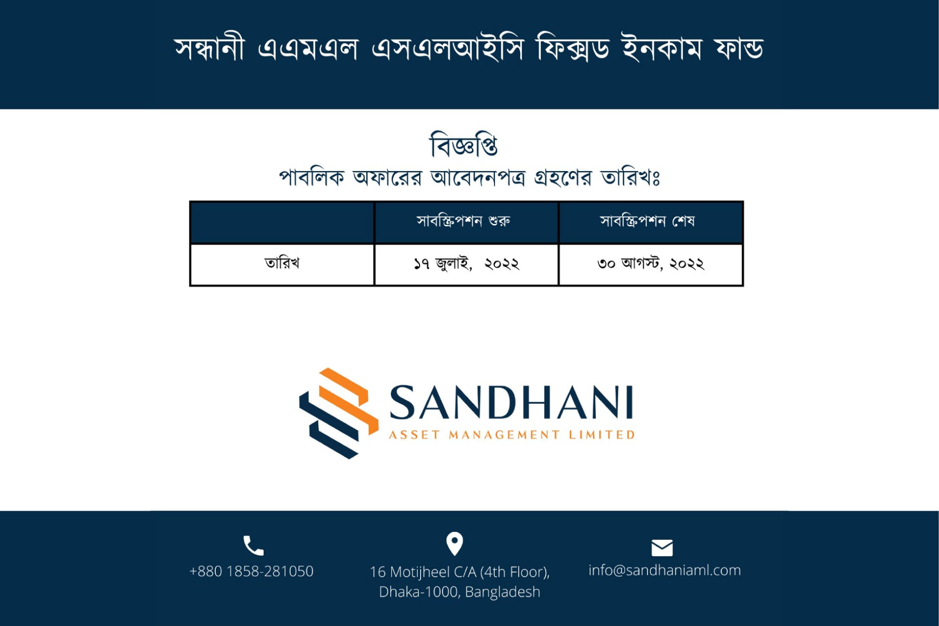 Sandhani AML SLIC Fixed Income Fund: NAV Tk. 13.38 | Buy Price Tk. 13.38 | Sale Price Tk. 13.38 || Sandhani AML SLFL Shariah Fund: NAV Tk. 10.00 | Buy Price Tk. 10.00 | Sale Price Tk. 10.00